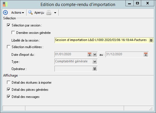 Détail des pièces générées : Cette option permet d'éditer le détail des pièces générées lors de l'import de la session.