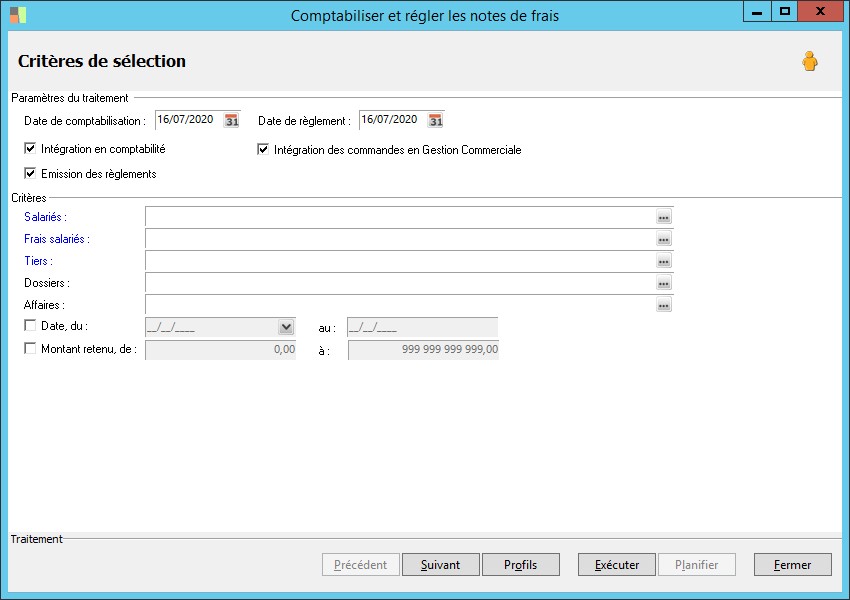 Cet écran permet de renseigner des critères de sélection des notes de frais à régler.