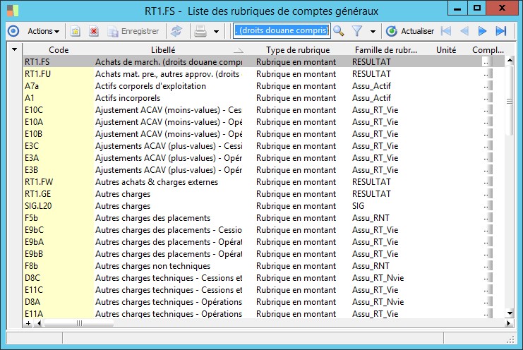 Cette fonction présente la liste des rubriques de comptes généraux créées. Rappelons qu'elles permettent de regrouper des montants ou des quantités enregistrées sur les comptes généraux.