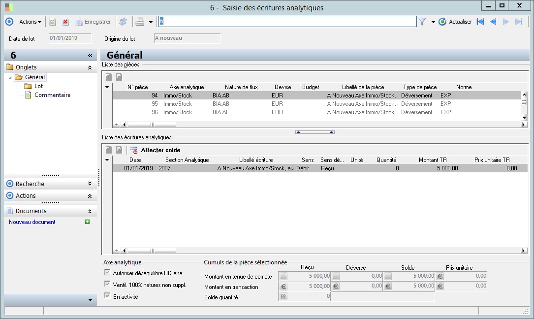 La ventilation à 100 % des natures non supplétives (natures de flux ayant des comptes de comptabilité générale rattachés) a 2 incidences :1- Dans le cas d'une ventiliation d'une écriture de comptabilité générale, elle implique que la validation des écritures analytiques de la pièce ne peut être effective que si la sommation de ses écritures est égale au montant de l'écriture de comptabilité générale.2- Dans le cas d'une écriture analytique pure portant sur une nature non supplétive, elle oblige que la pièce analytique soit équilibrée en débit-crédit (déversé-reçu) c'est-à-dire que le solde pièce soit nul.Cette restriction permet que le solde de la nature de flux soit le reflet de la comptabilité générale. En effet, seules les natures supplétives peuvent enregistrer des écarts de valorisation par rapport à la comptabilité générale.Attention : Un axe qui n'est pas ventilable à 100% dès l'origine ne peut plus le devenir. |