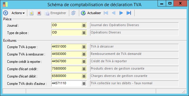 (Sage FRP 1000 Suite Financière) Menu Comptabilité > Paramètres > Comptabilité générale > Schéma de comptabilisation de déclaration TVA