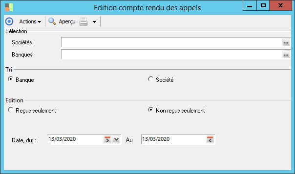 (Sage FRP 1000 Banque Paiement) Menu Banque Paiement >  Relevés et Notifications >  Relevés de comptes >  Edition compte rendu des appels