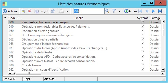 (Sage FRP 1000 Banque Paiement) Menu Banque Paiement > Paramètres > Remises > Liste des natures économiques