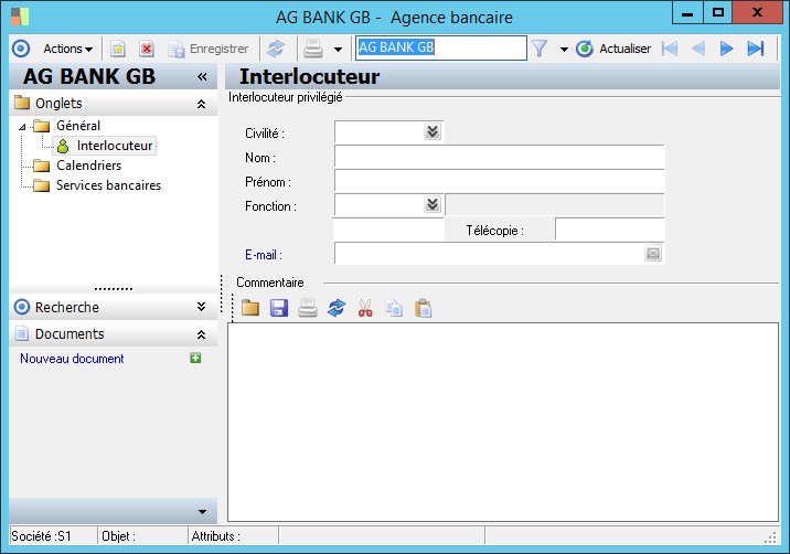 permet d'accéder à la fenêtre d'enregistrement des coordonnées de votre interlocuteur privilégié au sein de cette agence. Un seul interlocuteur peut être saisi.Présentation