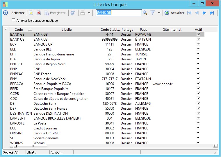 (Sage FRP 1000 Banque Paiement) Menu Banque Paiement > Paramètres > Banques > Liste des banques
