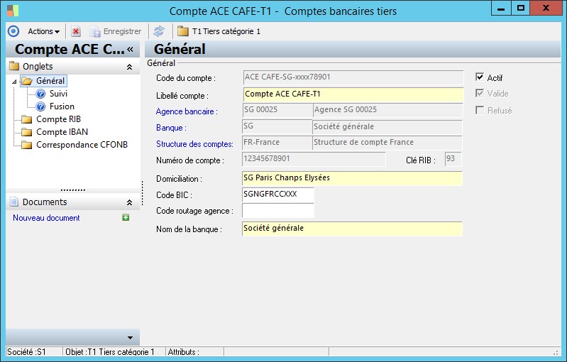La clé RIB française permet de vérifier que le numéro de compte a été correctement saisi. Ce contrôle peut être désactivé dans la fiche agence bancaire. |
