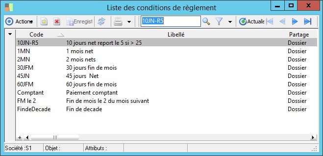 Cette fonction donne la liste et permet d'enregistrer les différentes conditions de règlement utilisées dans le programme.