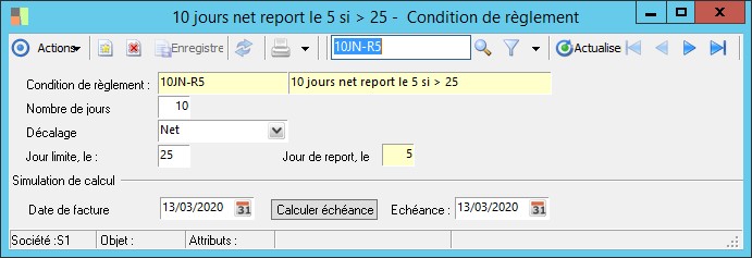 - si la valeur 0 (zéro) a été laissée dans ces mêmes zones, le programme considère qu'il s'agit d'un règlement comptant et ne propose aucun jour de tombée.