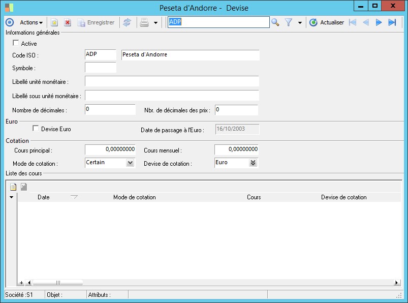 Cette zone indique le cours principal de la devise. Lorsqu'aucun cours à date n'est trouvé pour cette devise, c'est ce cours principal qui est utilisé.