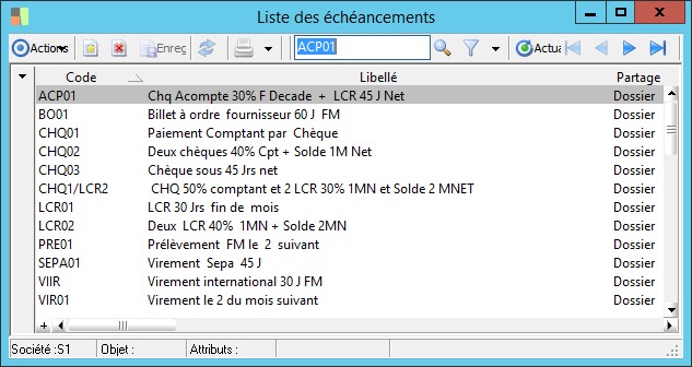 Cette fonction donne la liste et permet d'enregistrer les différentes échéances combinant modes de règlement et conditions de règlement.