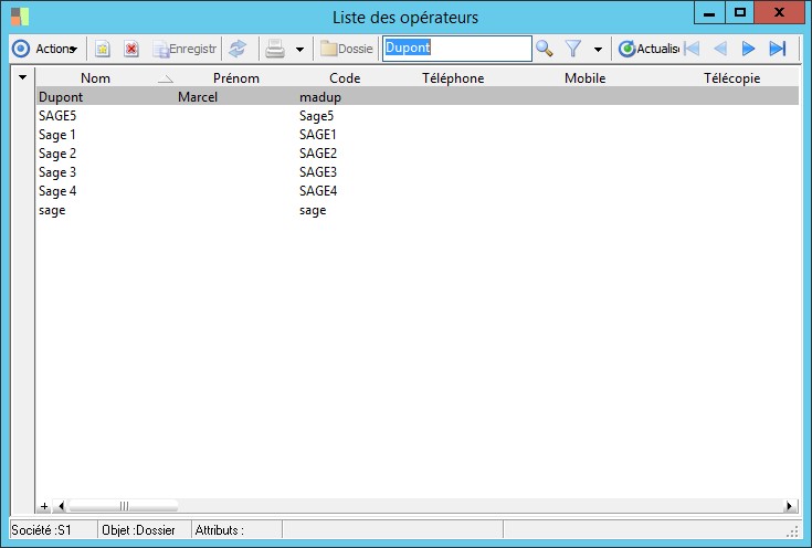(Sage FRP 1000 Banque Paiement) Menu Banque Paiement > Paramètres > Sociétés > Liste des opérateurs