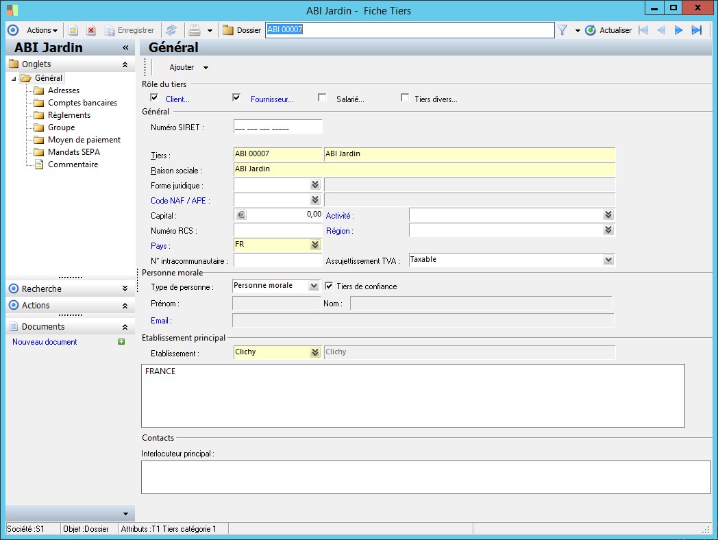 Un établissement principal est obligatoirement rattaché à un tiers. |