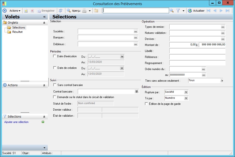 (Sage FRP 1000 Banque Paiement) Menu Banque Paiement > Ordres bancaires > Consultation des ordres par type > Consultation des Prélèvements