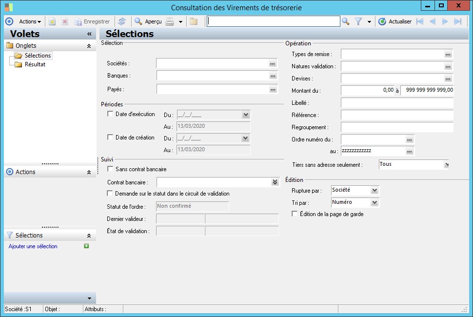 (Sage FRP 1000 Banque Paiement) Menu Banque Paiement > Ordres bancaires > Consultation des ordres par type > Consultation des Virements de trésorerie