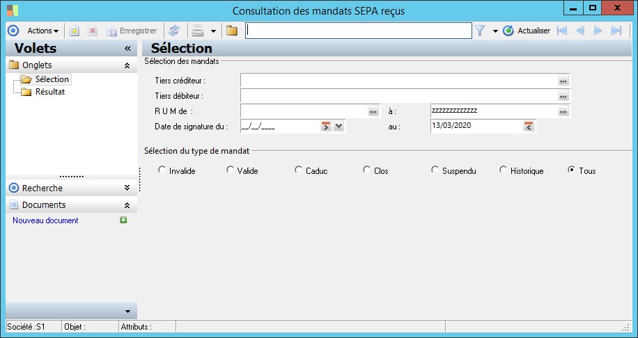 (Sage FRP 1000 Banque Paiement) Menu Banque Paiement > Paramètres > Tiers > Consultation des mandats SEPA reçus