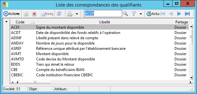 (Sage FRP 1000 Banque Paiement) Menu Banque Paiement > Paramètres > Relevés > Liste des correspondances des qualifiants