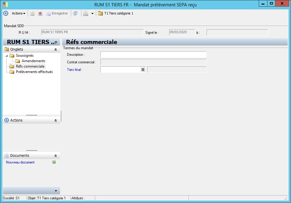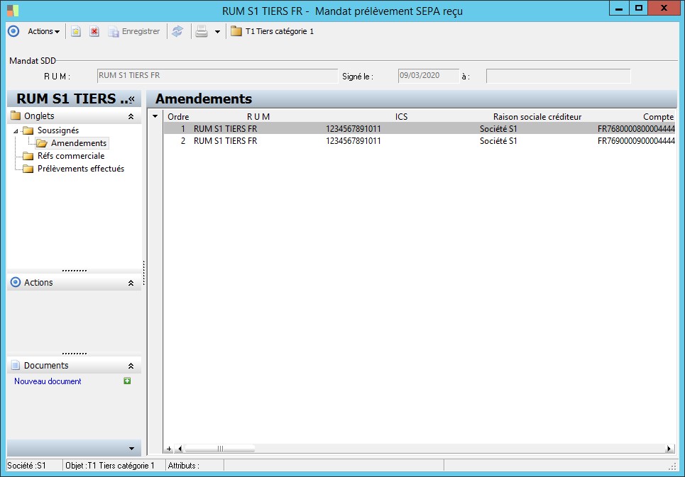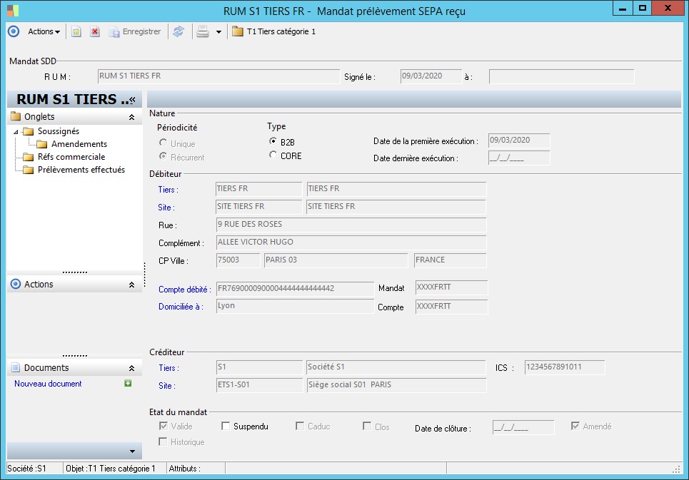 (Sage FRP 1000 Banque Paiement) Menu Banque Paiement > Paramètres > Tiers > Mandat prélèvement SEPA reçu