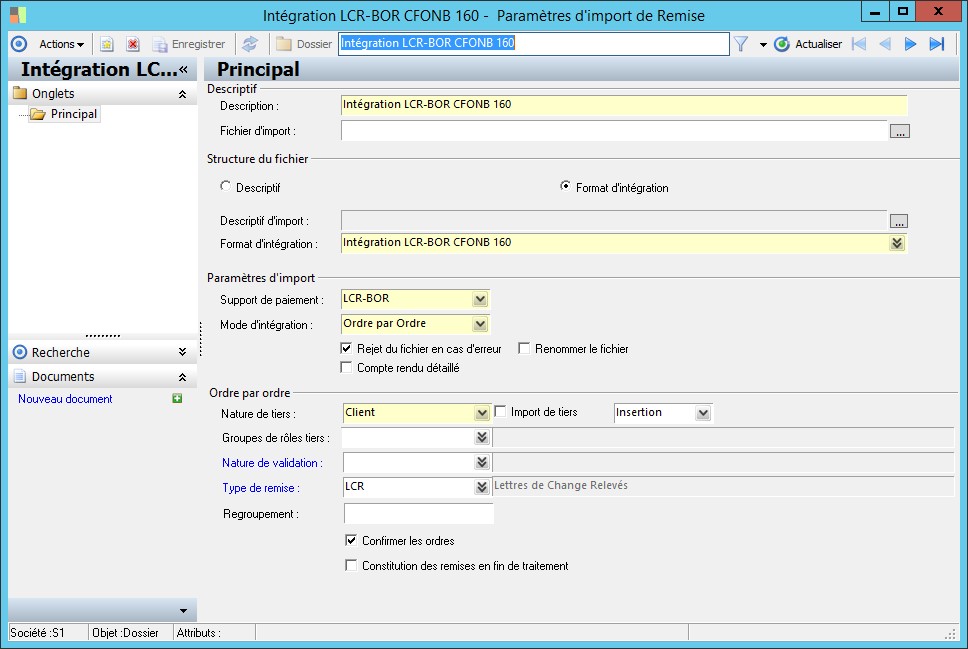 (Sage FRP 1000 Banque Paiement) Menu Banque Paiement > Paramètres > Paramètres d'import de Remise