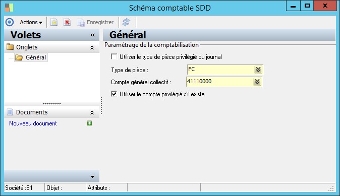 Pour leschémade comptabilisation SDD, vous pouvez définir le type de pièceet le compte général collectif à générer.