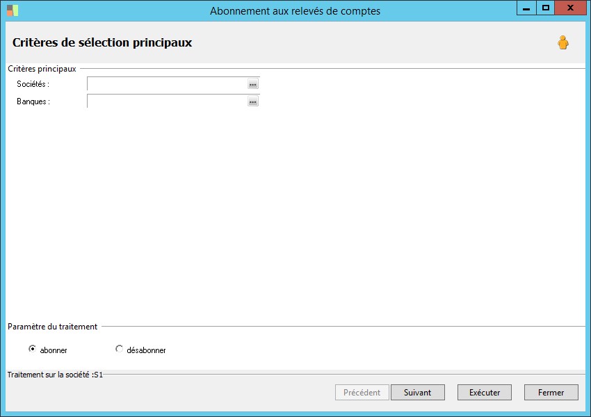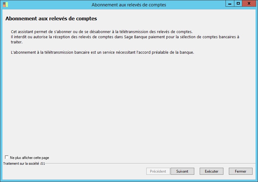 (Sage FRP 1000 Banque Paiement) Menu Banque Paiement > Paramètres > Relevés > Abonnement aux relevés de comptes