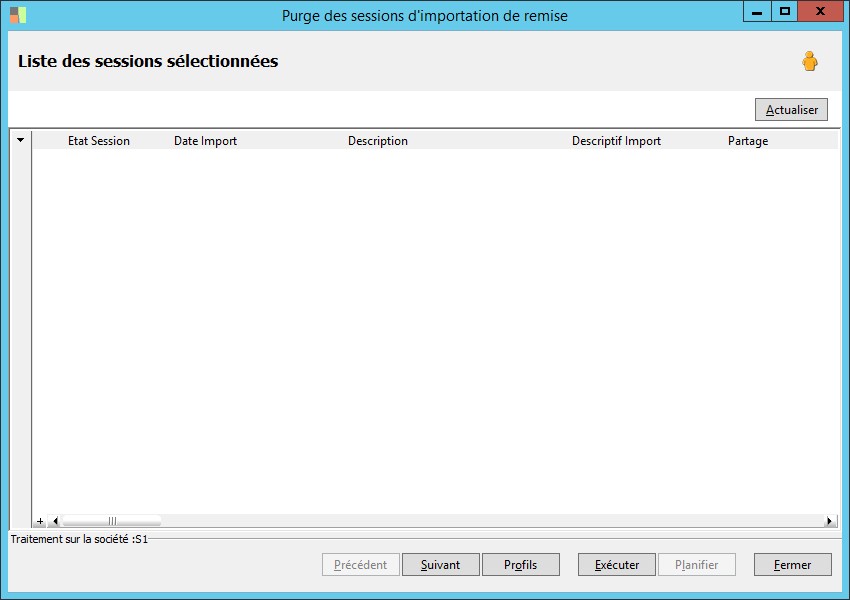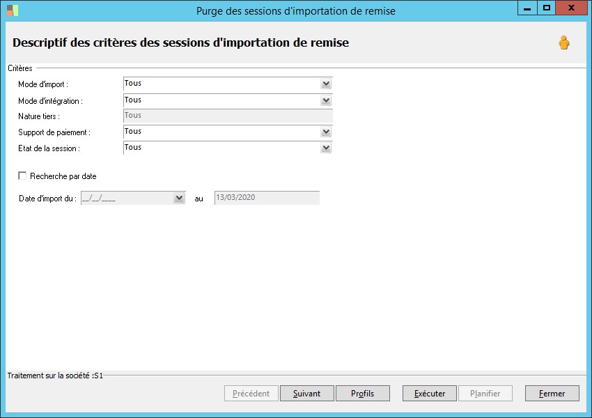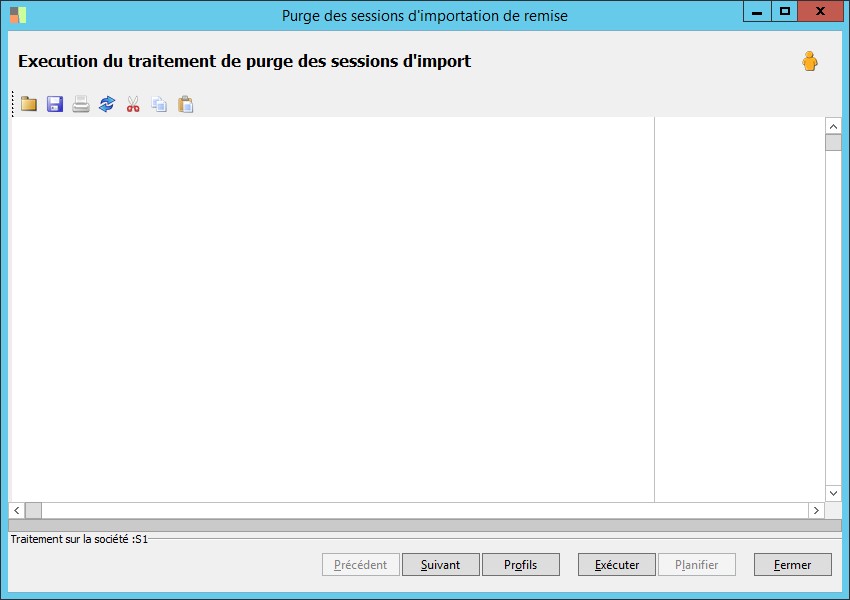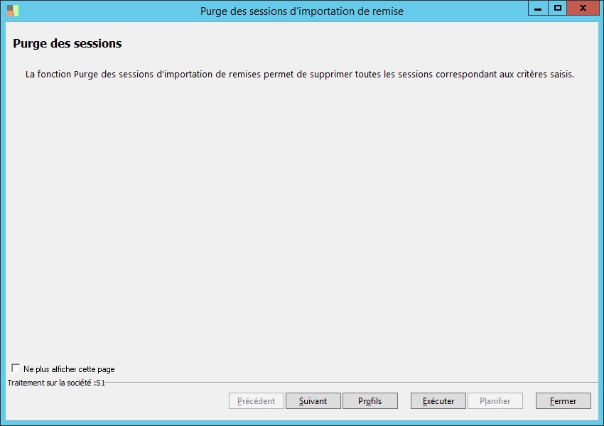 (Sage FRP 1000 Banque Paiement) Menu Banque Paiement > Ordres bancaires > Purge des sessions d'importation de remise