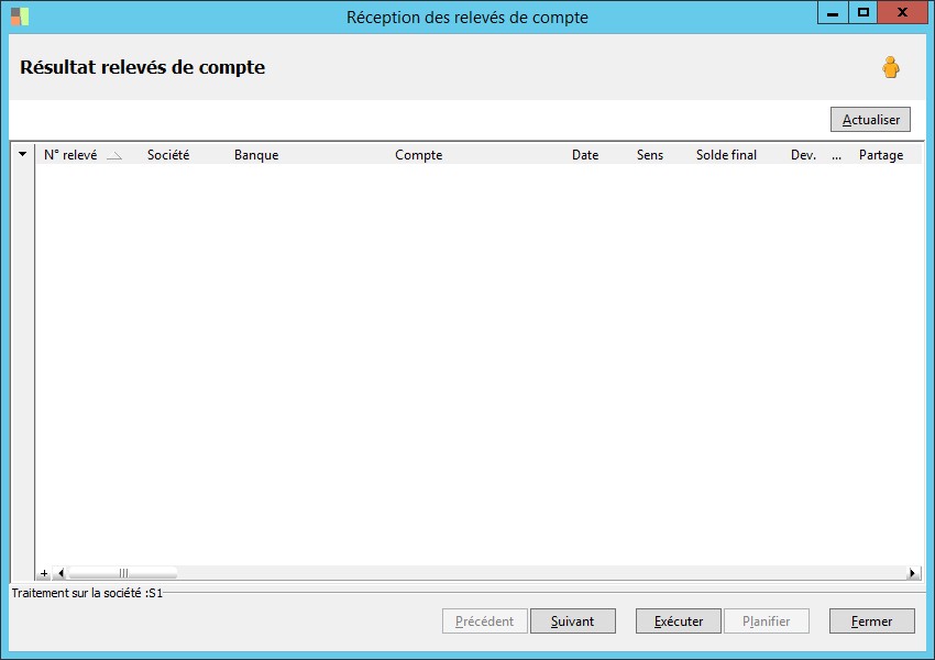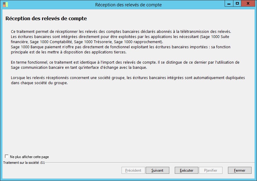 (Sage FRP 1000 Banque Paiement) Menu Banque Paiement > Relevés et Notifications > Relevés de comptes > Réception des relevés de compte