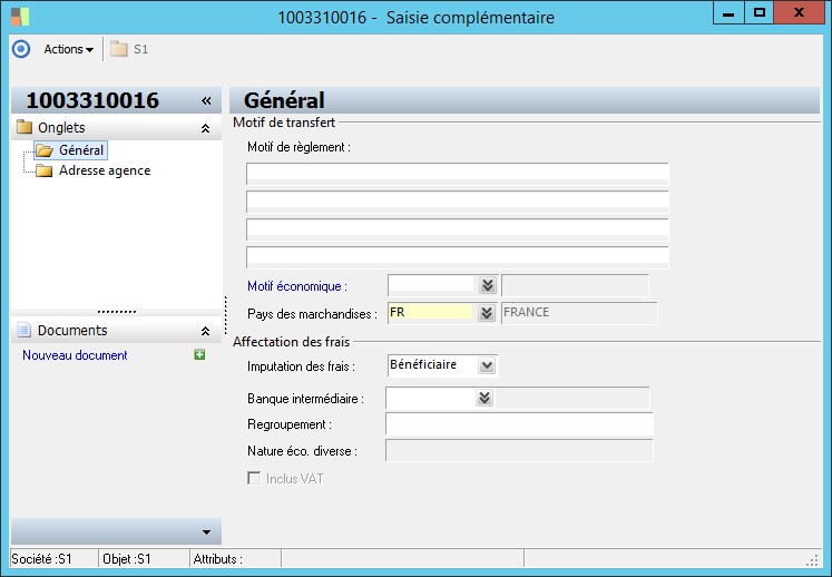 Cette zone indique la référence de l'agence bancaire servant d'intermédiaire pour le traitement du virement international et déplacé. |
