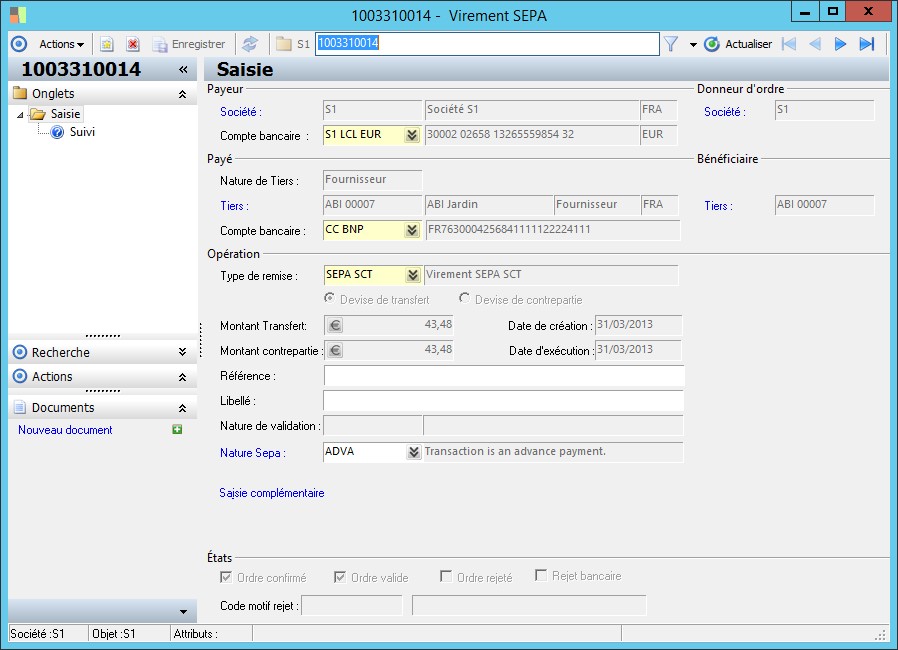 (Sage FRP 1000 Banque Paiement) Menu Banque Paiement > Ordres bancaires > Virement SEPA