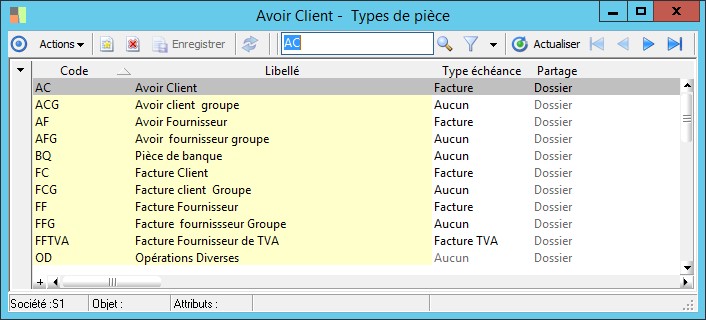 (Sage FRP 1000 Banque Paiement) Menu Banque Paiement > Paramètres > Comptabilisation > Types de pièce