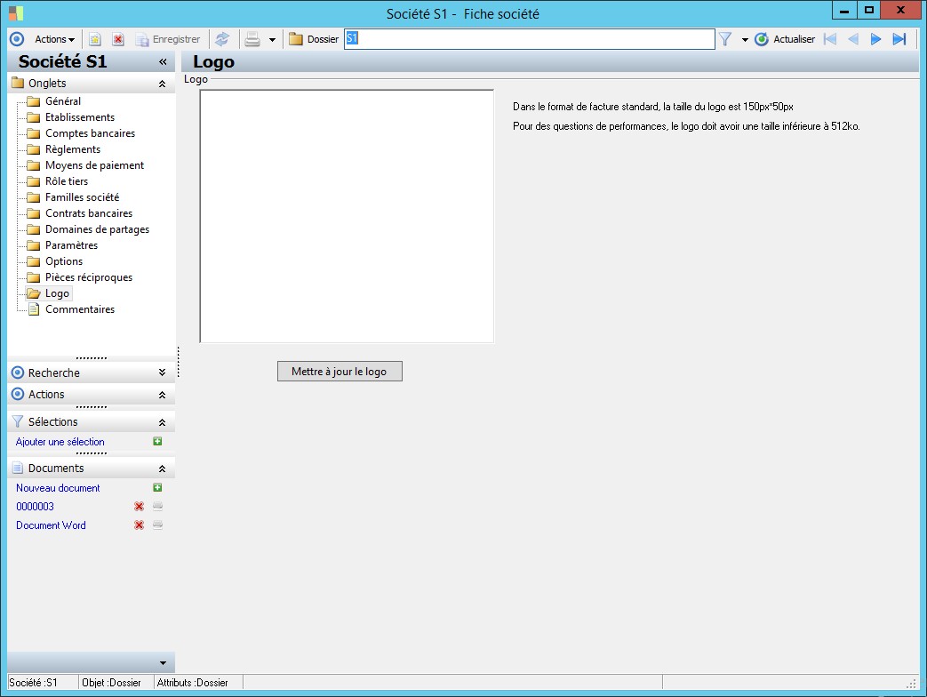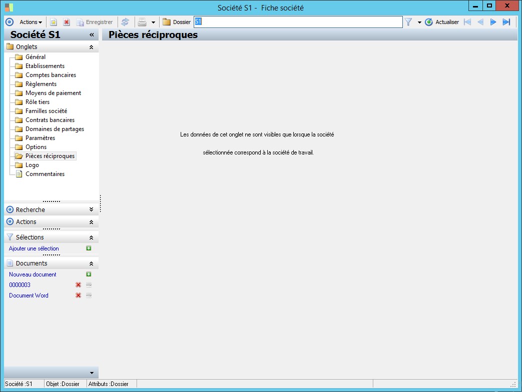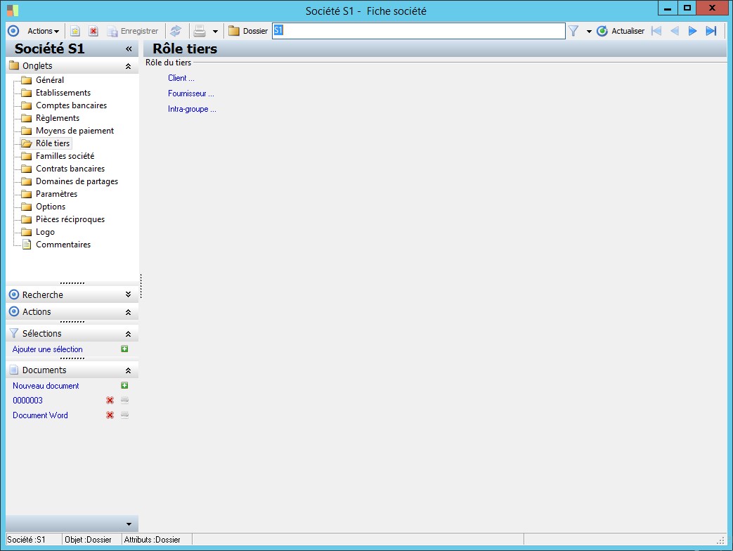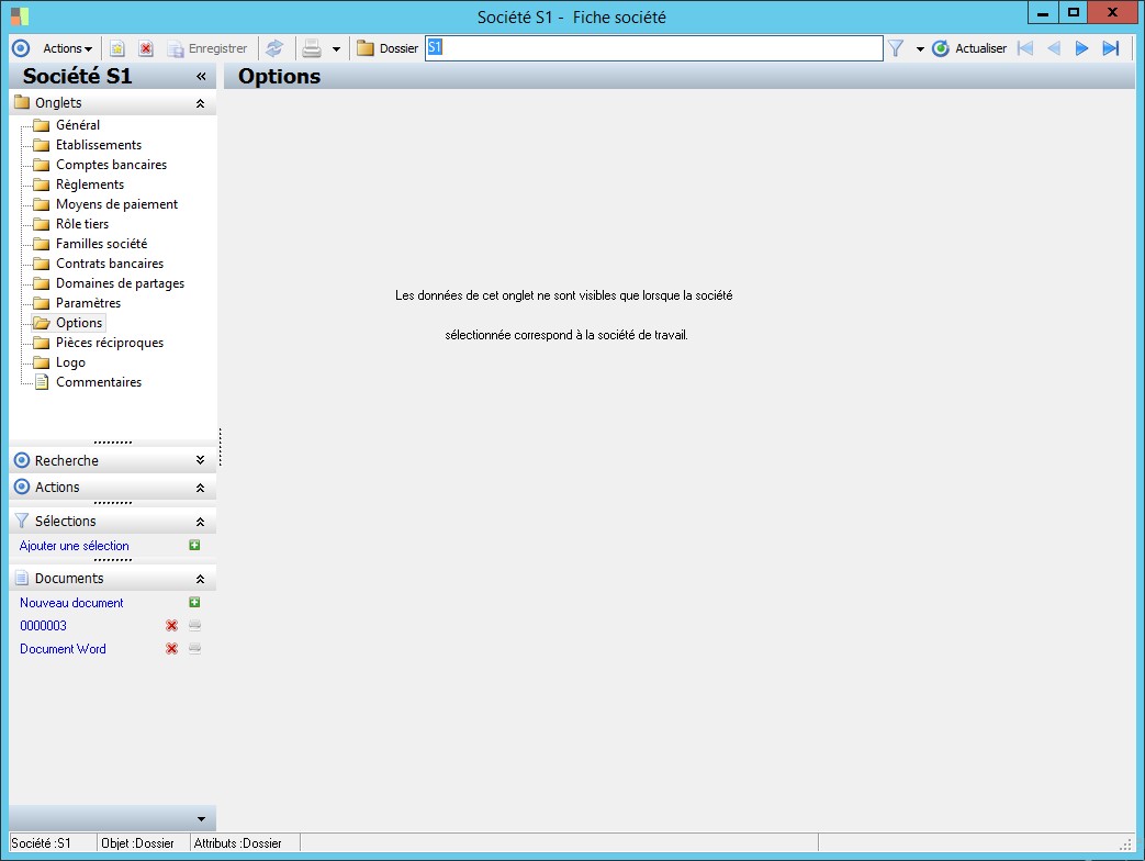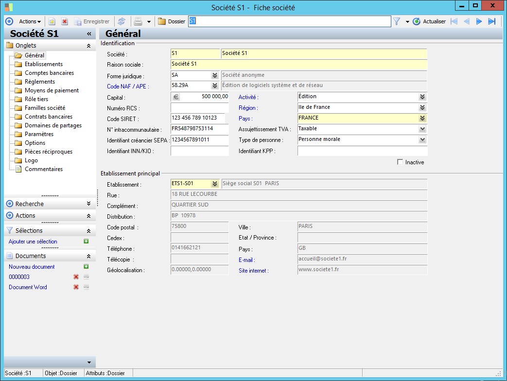 Dans la fenêtre Fiche société, la présence des fonctions décrites dans ce contexte dépend des applications installées. |