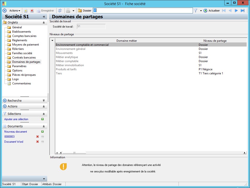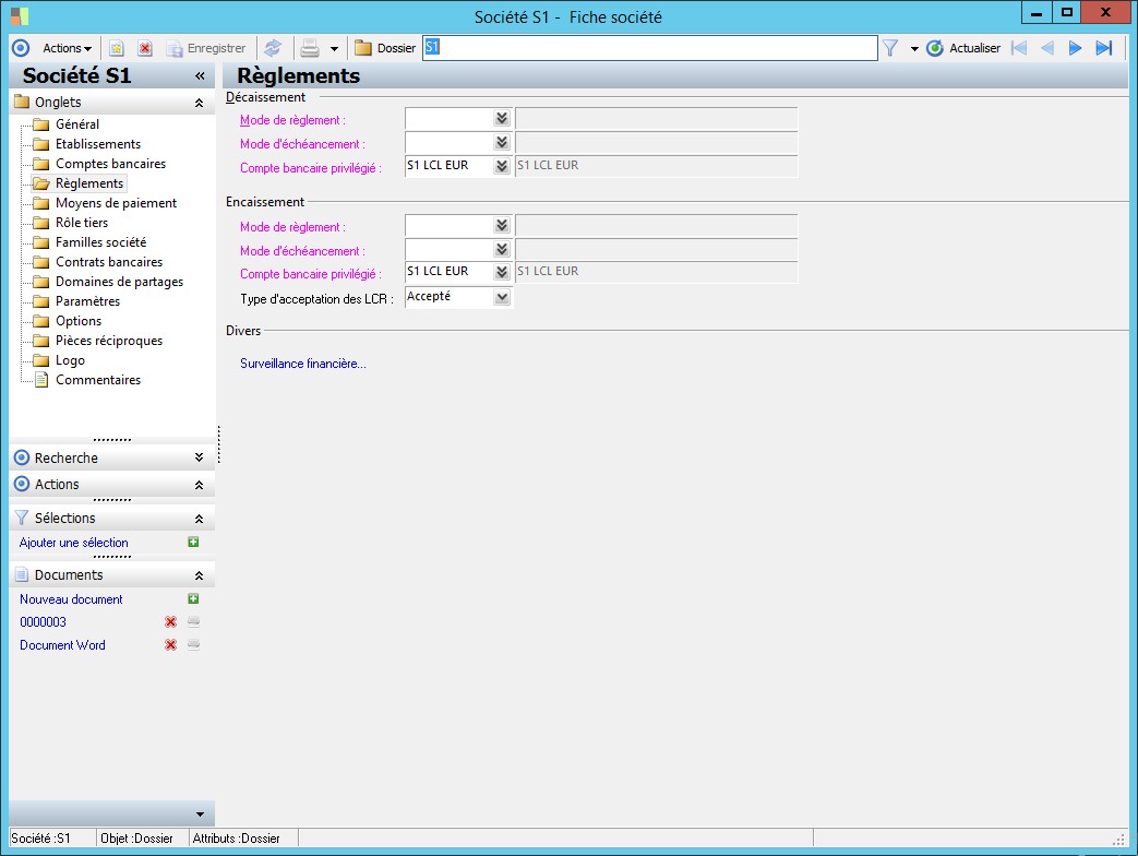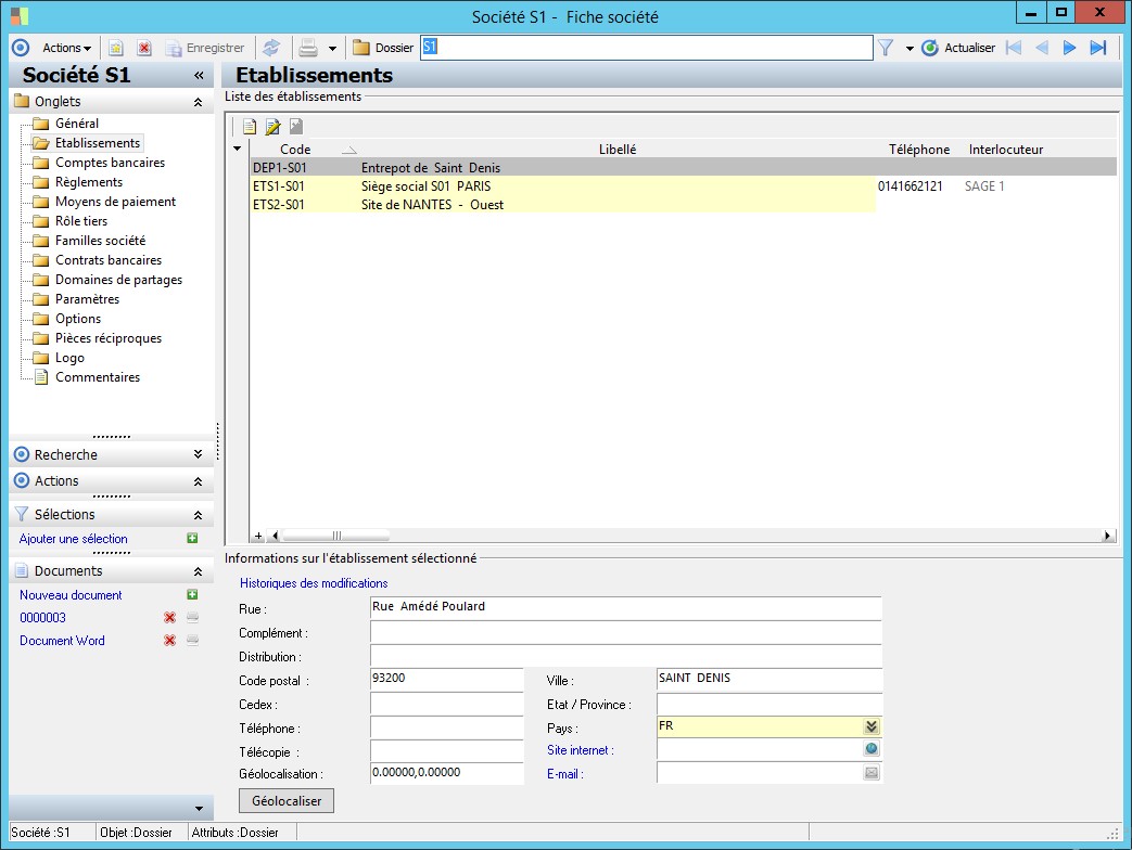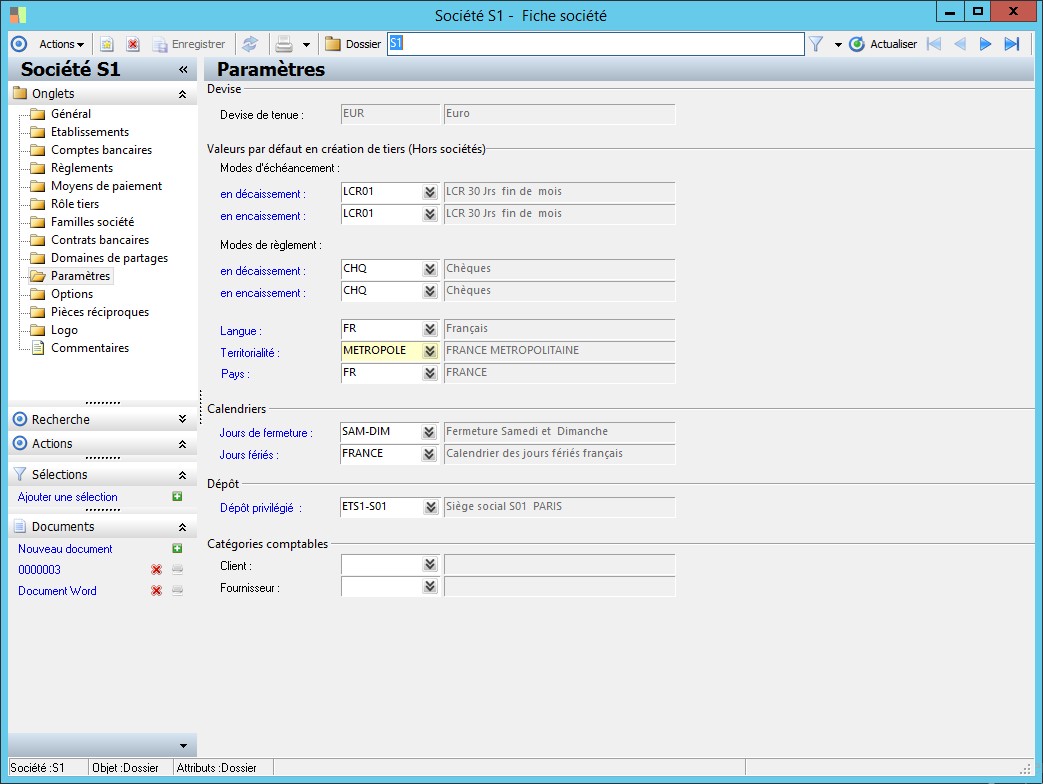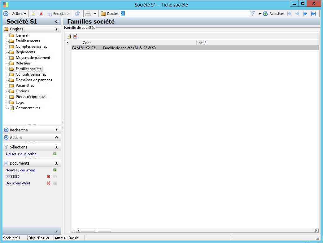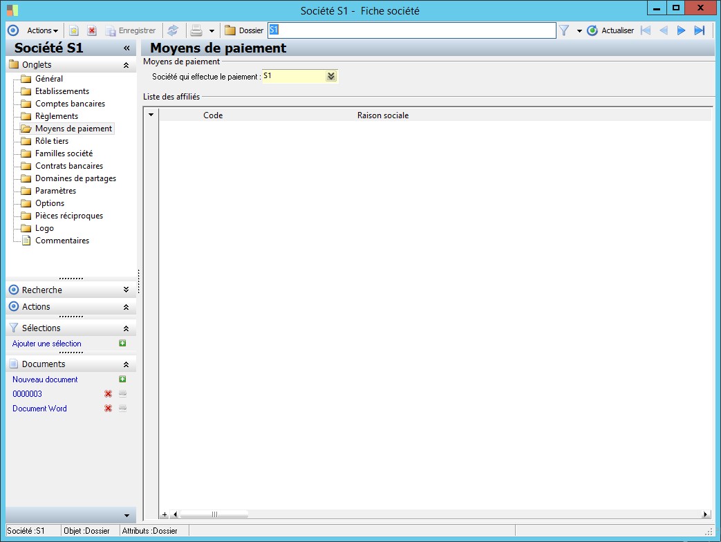 Dans la fenêtre Fiche société, la présence des fonctions décrites dans ce contexte dépend des applications installées. |