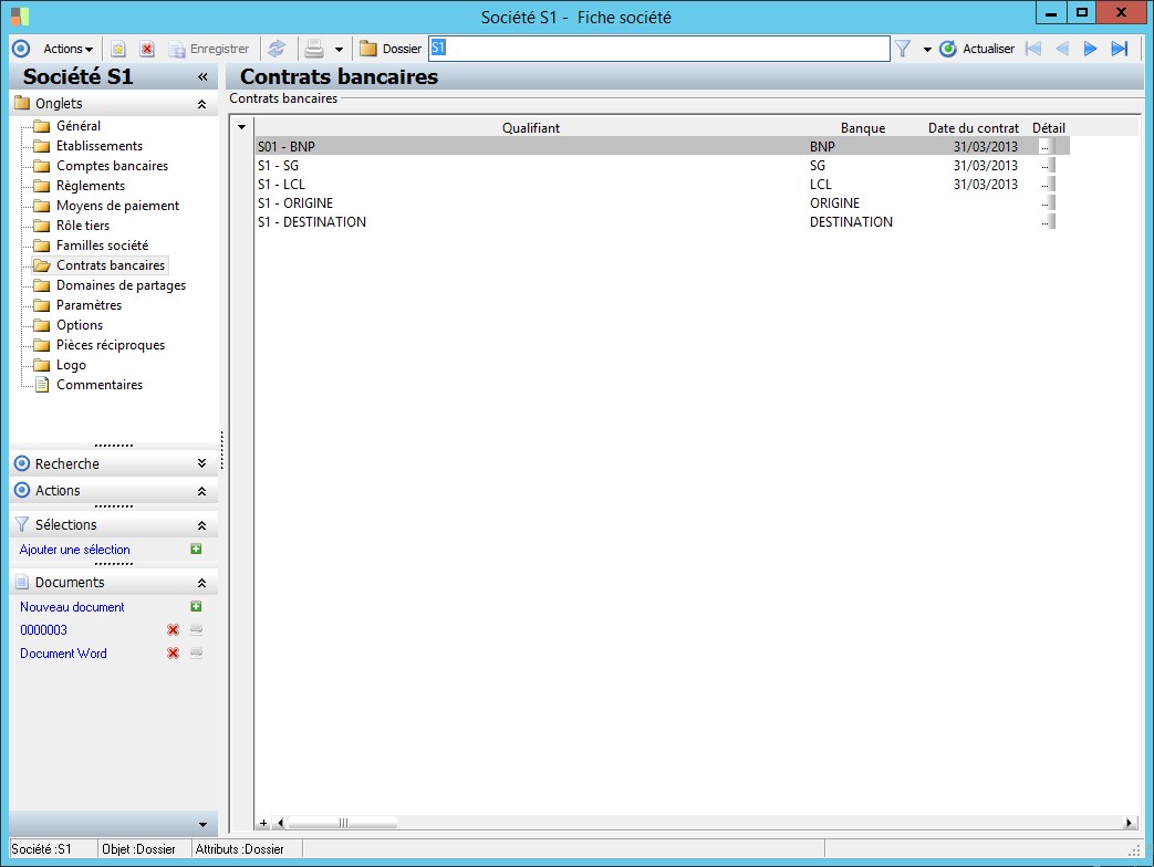 Cette classe regroupe les contratsbancaires établis avec les différentes banques des sociétés. |