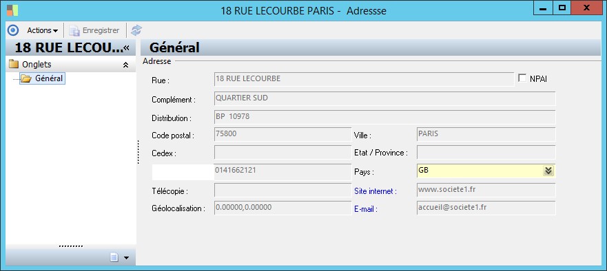 Cette zone permet de renseigner le numéro de télécopie correspondant à l'adresse. |