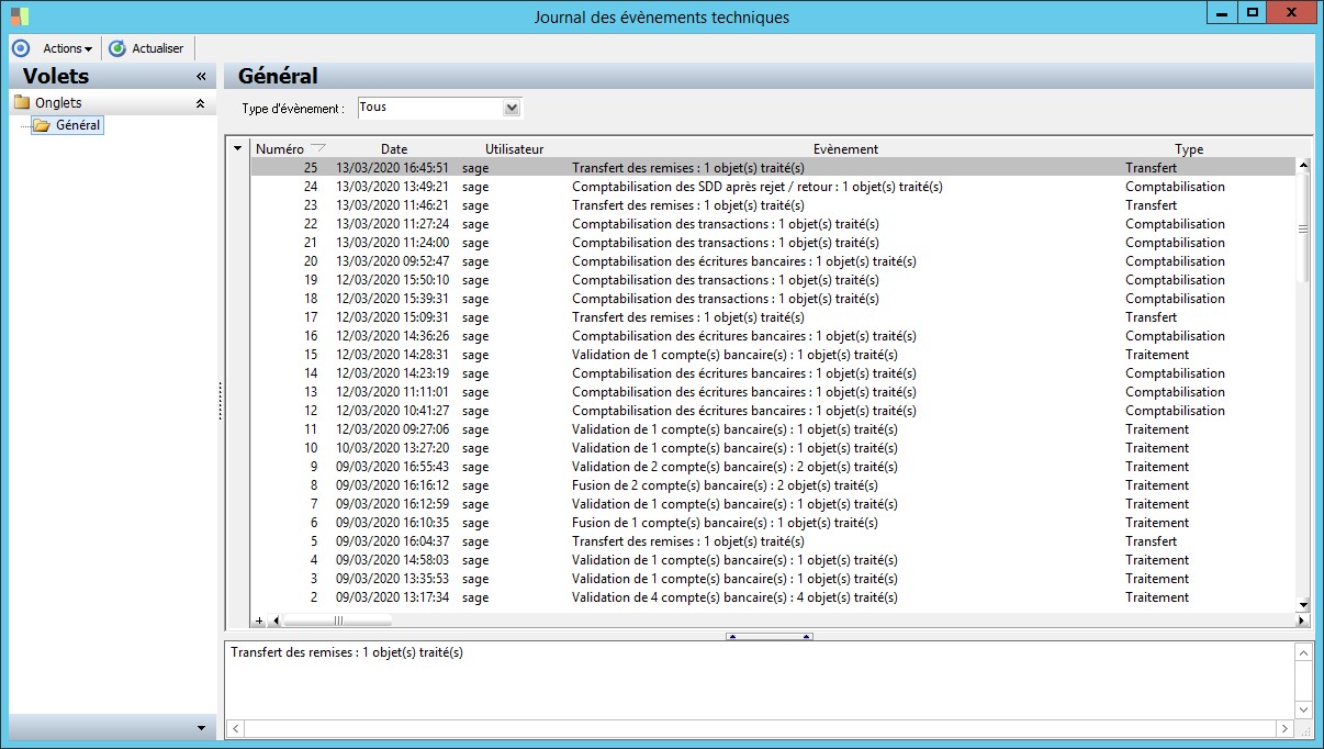 (Sage FRP 1000 Banque Paiement) Menu Banque Paiement > Outils > Journal des évènements techniques