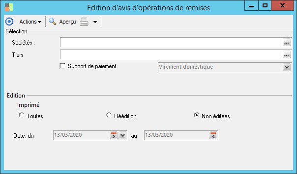 (Sage FRP 1000 Banque Paiement) Menu Banque Paiement > Remises bancaires > Edition d'avis d'opérations de remises