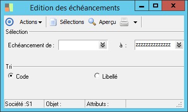 Cette fonction permet d'éditer la liste des échéancements en fonction de certains critères de sélection. Elle est lancée par la fonction Impression de la liste et de la fiche des échéancements, elles-mêmes accessibles au niveau du menu Paramètres / Règlements / Echéancements.