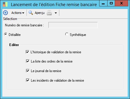 (Sage FRP 1000 Banque Paiement) Menu Banque Paiement >  Ordres bancaires >  Lancement de l'édition Fiche remise bancaire