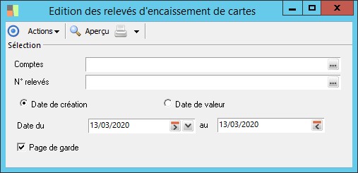 (Sage FRP 1000 Banque Paiement) Menu Banque Paiement >  Relevés et Notifications >  Relevés d'encaissement de cartes  >  Edition des relevés d'encaissement de cartes
