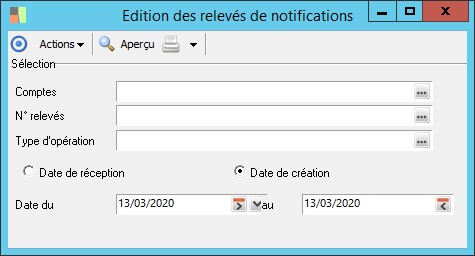 L'édition des relevés de notificationspeut être filtrée par comptes bancaires,numéros de relevés, typesd'opération, et date de réception ou de création. Pour consulter les relevés, cliquer sur le bouton Aperçu . Pour les imprimer,sélectionner Imprimer dans le menu de l'icône Imprimante.