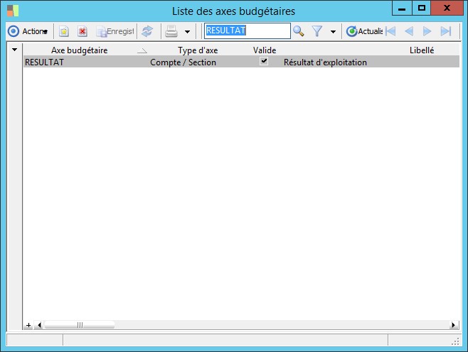 (Sage FRP 1000 Comptabilité) Menu Budget > Paramètres > Liste des axes budgétaires