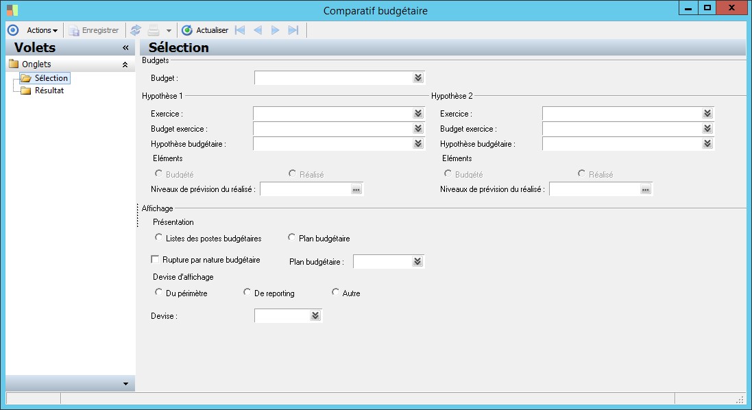 L'entrée Sélections permet de sélectionner les deux hypothèses que vous souhaitez comparer et de définir le mode d'affichage (présentation des postes par liste, ou par plan budgétaire?).