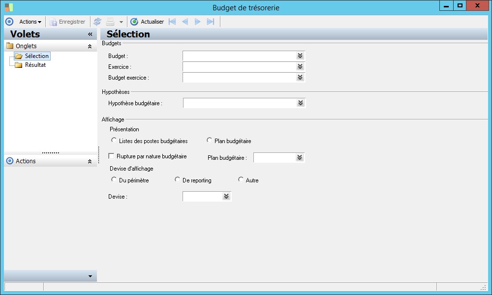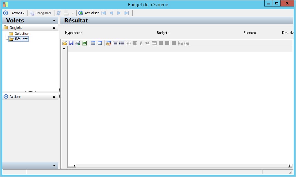 Après activation du bouton Actualiser, l'entrée Résultat vous présente le budget de trésorerieselon les critères définis dans l'entrée Sélections.