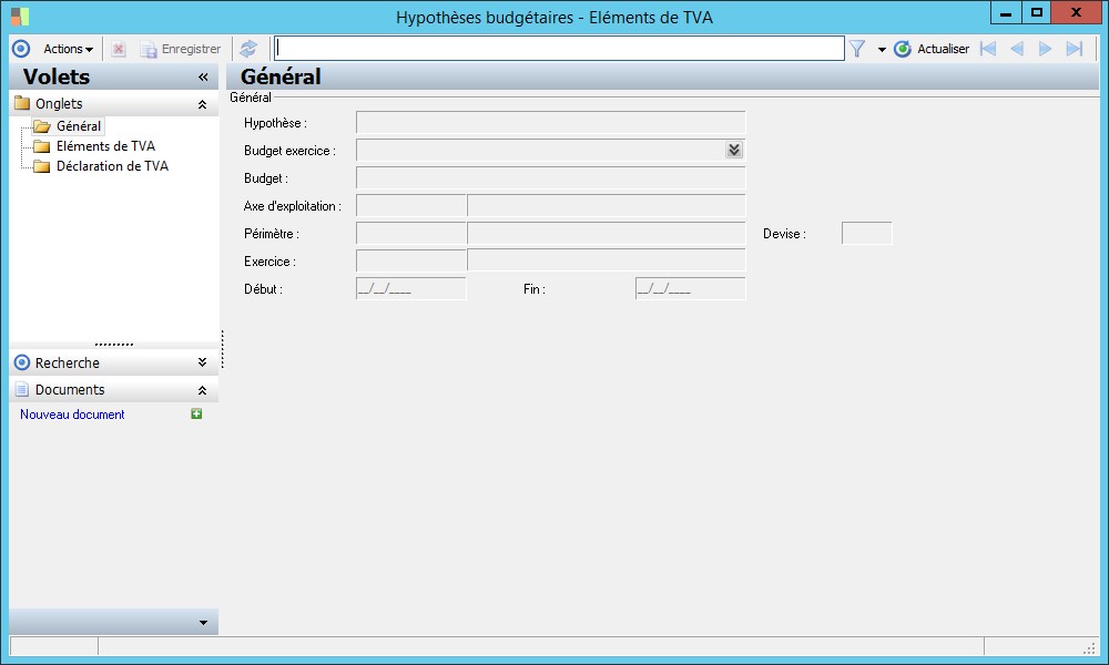(Sage FRP 1000 Comptabilité) Menu Budget > Analyses > Hypothèses budgétaires - Eléments de TVA