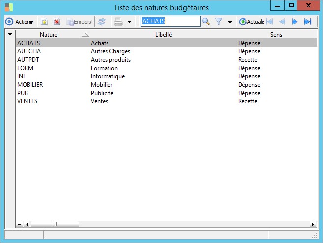 Cet écran vous présente la liste des natures budgétaires, en précisant pour chacune leur code, leur libellé et leur sens.