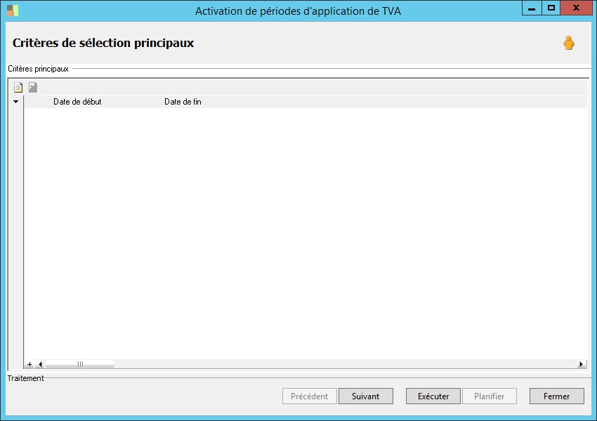 Il s'agit de la date de début de la période d'application de TVA. Cette date doit être une date de début de période.Concernant la première période d'application de TVA créée : pour qu'elle soit valide, il ne doit pas exister d'écriture au delà de la date inférieure de cette période. |