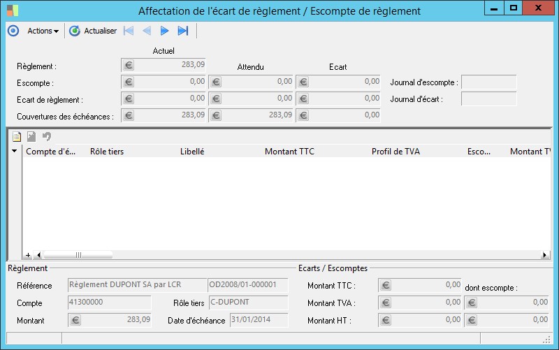 Ce montant est renseigné lorsqu'on affecte l'écart constaté entre la couverture des échéances liées au règlement et la couverture du règlement.Pour valider le règlement, cet écart doit être totalement affecté, c'est à dire que l'écart affecté doit être identique à l'écart constaté. |