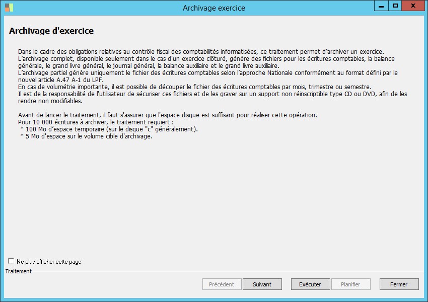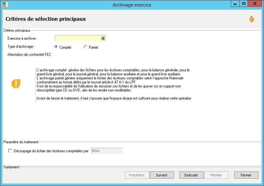 Ce paramètre permet de choisir le traitement à effectuer :- L'archivage complet gènère des fichiers pour les écritures comptables, pour la balance générale, pour le grand livre général, pour le journal général, pour la balance auxiliaire et pour le grand livre auxiliaire. Ce type d'archivage ne peut être sélectionné que pour un exercice clôturé.- L'archivage partiel génère uniquement le fichier des écritures comptables selon l'approche Nationale conformément au format défini par le nouvel article A.47 A-1 du LPF. |