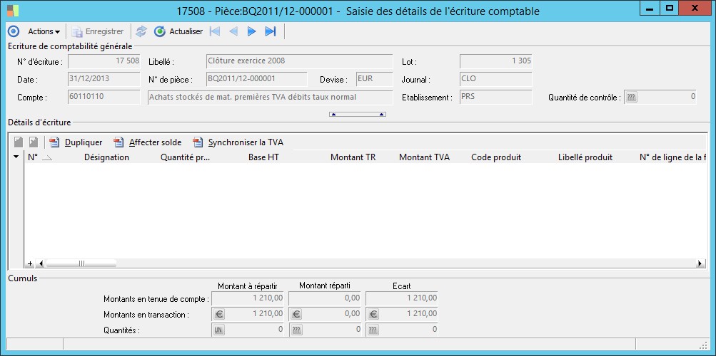 La modification du montant sur une écriture de TVA est sans incidence sur les détails d'écriture des écritures de HT : vous devez les modifier manuellement le cas échéant.