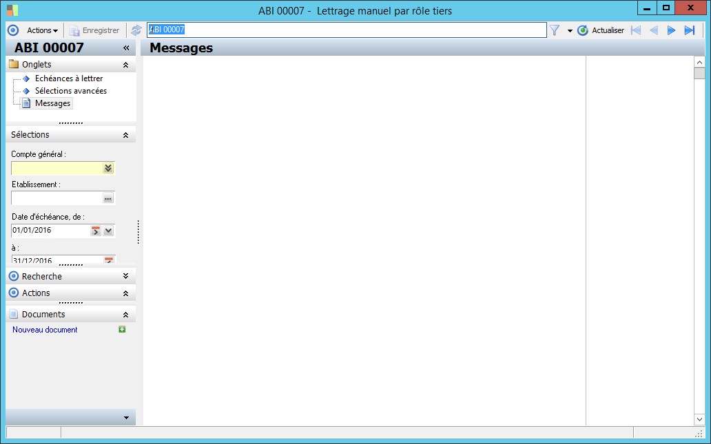 Les zones Rôle tiers, Devise de lettrage (de la partie supérieurede la fenêtre)et Date de saisie de lettrage (de la partie inférieure de la fenêtre) doivent être impérativement renseignées. |