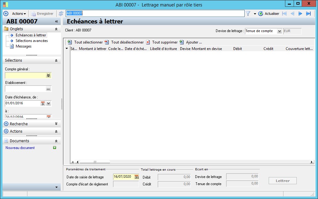 Ce montant indique l'écart de lettrage constaté dans la devise de lettrage : il correspond à la différence entre le total débit et le total crédit des échéances sélectionnées. |
